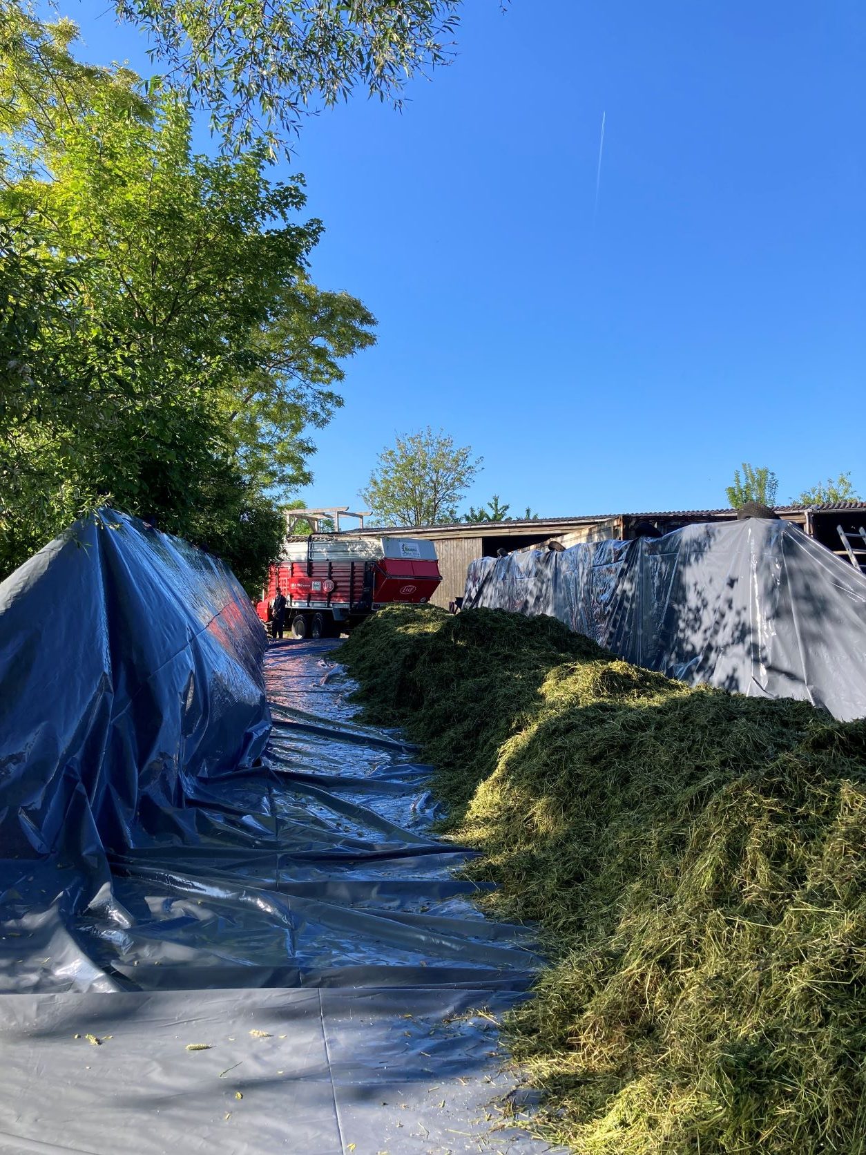 Am Sonntag konnten wir den ersten Schnitt von unseren Grünland- und Kleegraßlächen einfahren und eines unserer beiden Fahrsilos füllen.