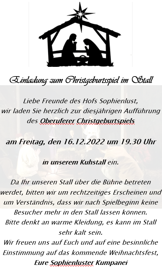 Unser Christgeburtsspiel findet dieses Jahr am Freitag den 16.12.2022 um 19:30 Uhr im Kuhstall statt.