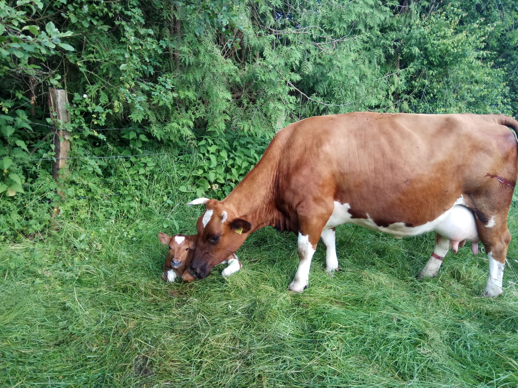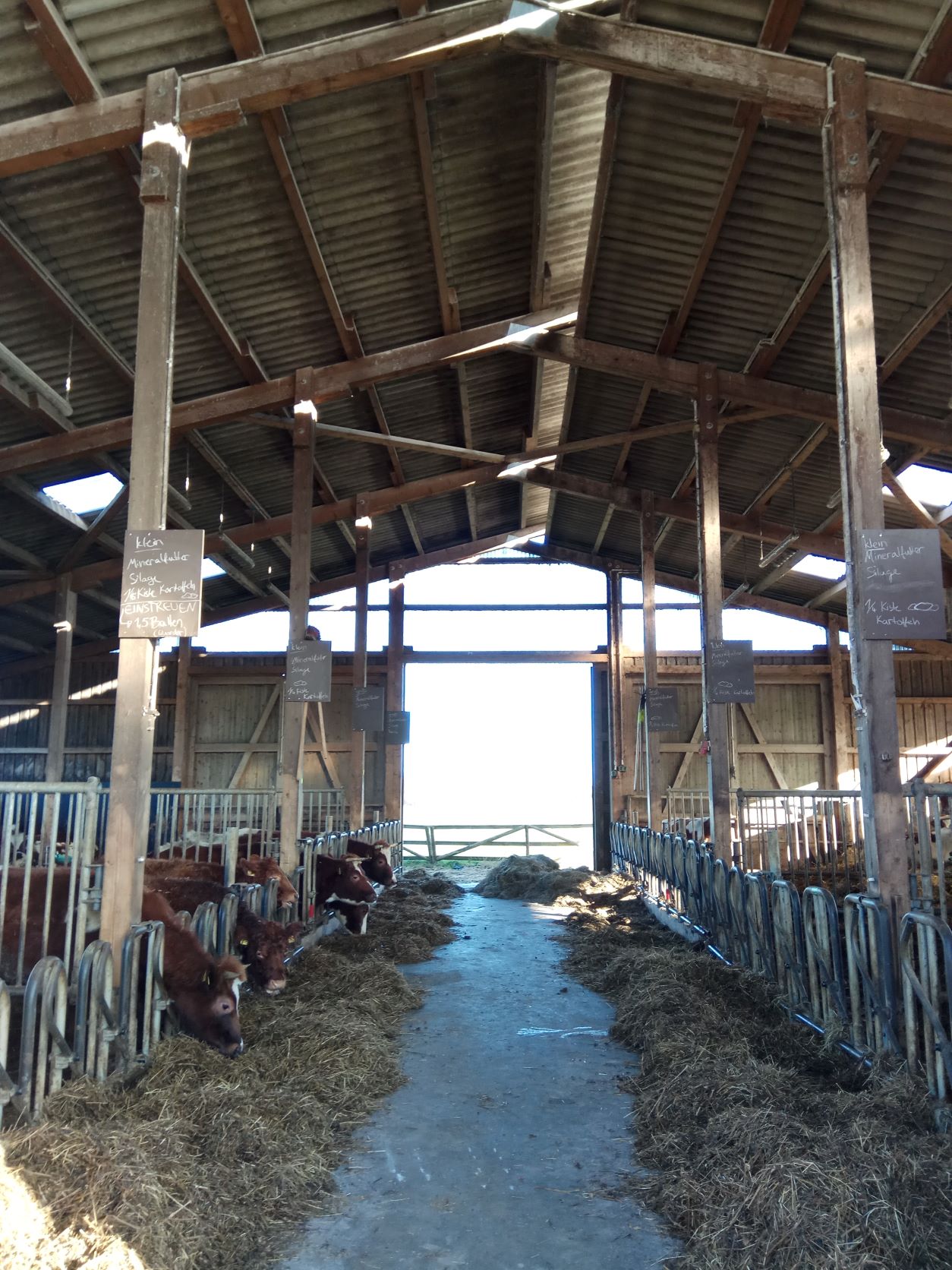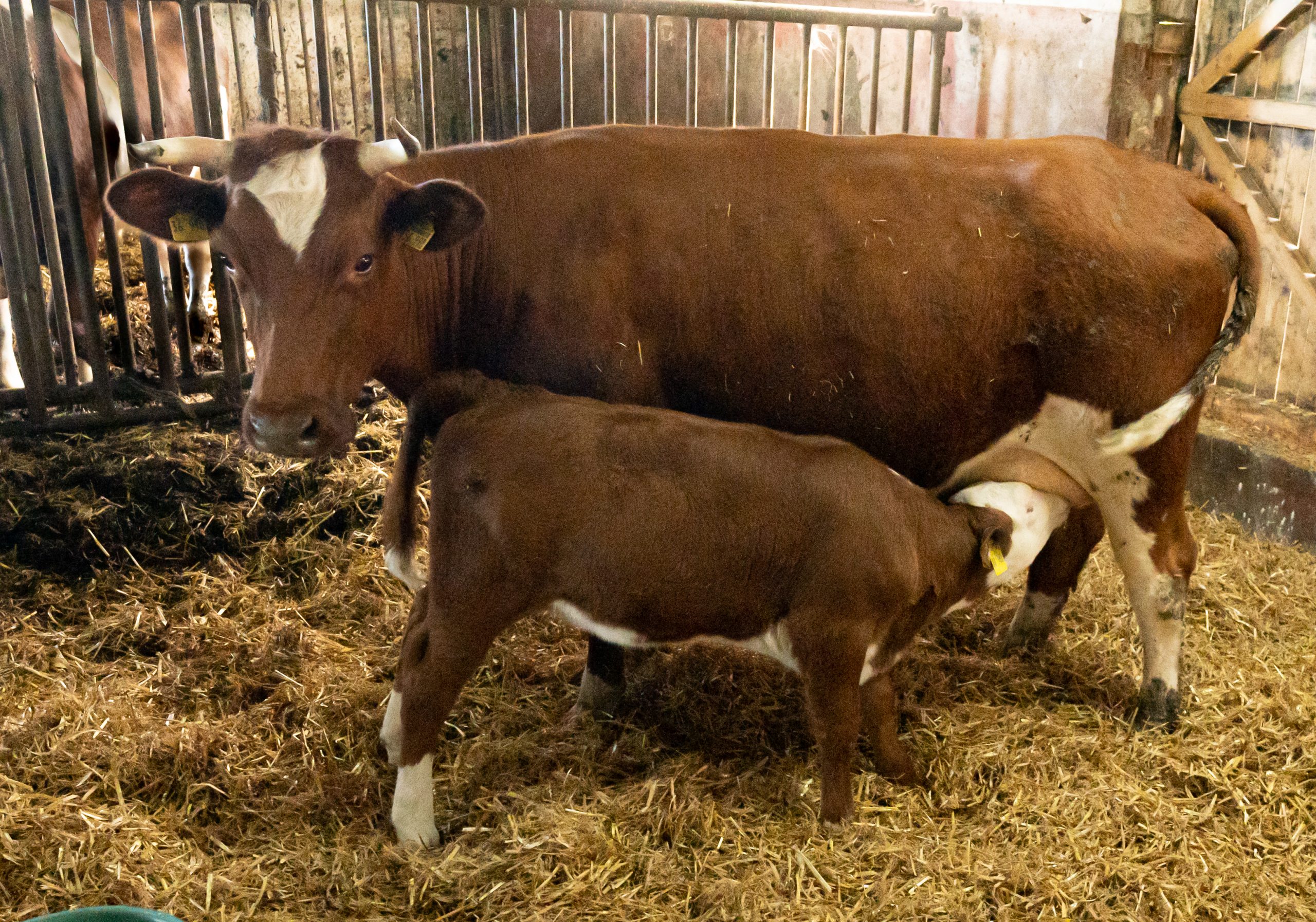 Wenn bei uns ein Kalb auf die Welt kommt, darf es die ersten Tage zusammen mit der Mutter in einem seperaten Abteil im Stall verbringen. Hier kann es zu jeder Zeit Milch trinken so viel es braucht und sich in der neuen Welt zurechtfinden.