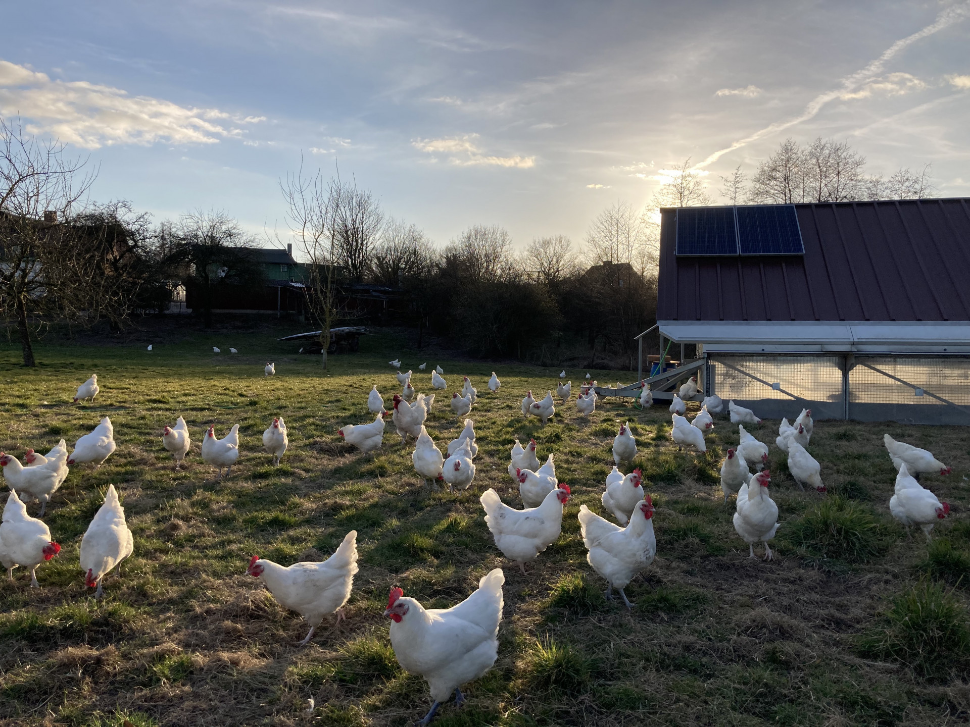 Im Jahr 2013 wurde das erste Hühnermobil angeschafft. Mittlerweile haben wir Zwei, in denen jeweils 225 Legehennen gehalten werden können. Aktuell haben wir in einem Stall Legehennen der Rasse ÖTZ “cream”, was eine Doppelnutzungsrasse ist, in dem anderen Stall halten wir Legehennen der Rasse Lohmann Brown.